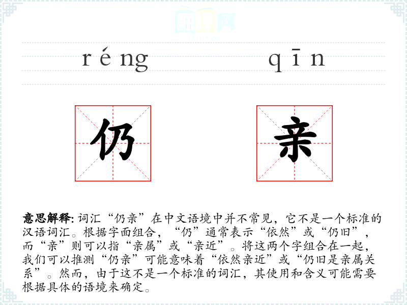 词汇“仍亲”在中文语境中并不常见,它不是一个标准的汉语词汇。根据字面组合,“仍”通常表示“依然”或“仍旧”,而“亲”则可以指“亲属”或“亲近”。将这两个字组合在一起,我们可以推测“仍亲”可能意味着“依然亲近”或“仍旧是亲属关系”。然而,由于这不是一个标准的词汇,其使用和含义可能需要根据具体的语境来确定。