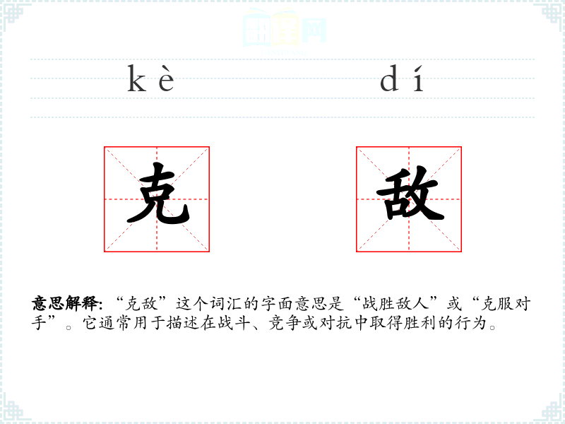 “克敌”这个词汇的字面意思是“战胜敌人”或“克服对手”。它通常用于描述在战斗、竞争或对抗中取得胜利的行为。