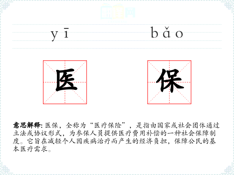 - 反义词:自费医疗(指不使用医保,完全由个人承担医疗费用)