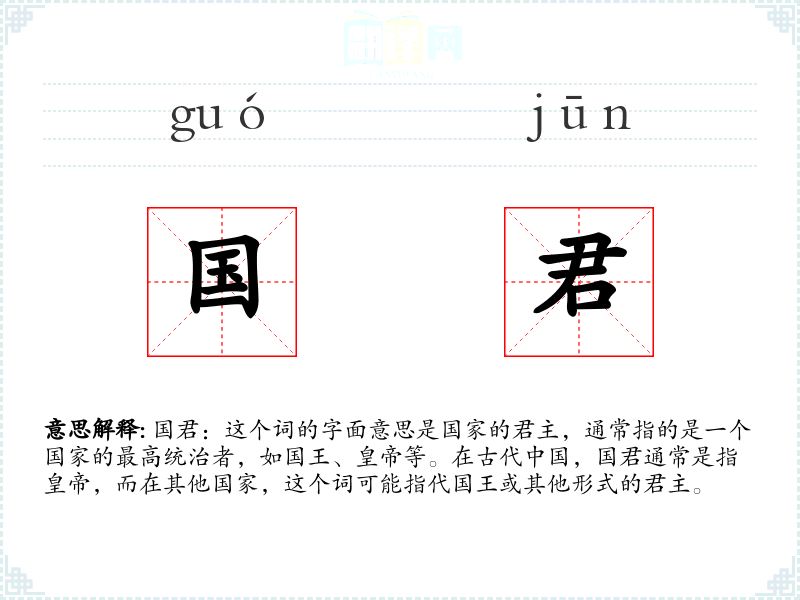 国君:这个词的字面意思是国家的君主,通常指的是一个国家的最高统治者,如国王、等。在古代,国君通常是指**,而在其他国家,这个词可能指代国王或其他形式的君主。
