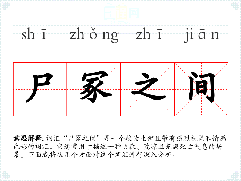 在其他语言中,可能没有完全对应“尸冢之间”这个词汇的表达,但类似的表达如“cemetery”(墓地)或“graveyard”(坟场)在英语中较为常见。这些词汇虽然不如“尸冢之间”那样带有强烈的负面情感,但也能传达出类似的氛围。