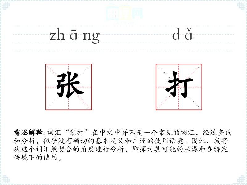 由于“张打”不是一个标准词汇,我们无法给出一个确切的基本定义。它可能是某个方言词汇,或者是某个特定行业或社群中的术语。