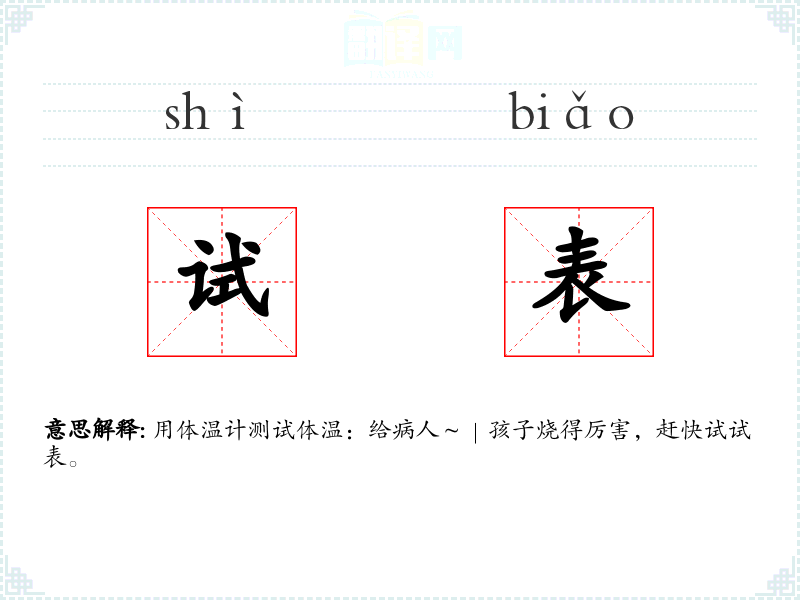 用体温计测试体温:给病人~|孩子烧得厉害,赶快试试表。