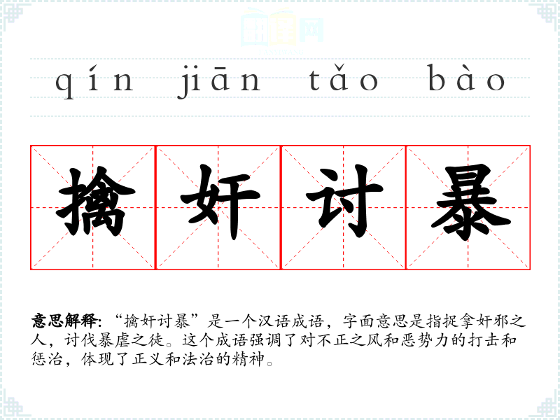 “擒奸讨暴”这个成语的词源较为明确,由“擒”、“奸”、“讨”、“暴”四个字组成,每个字都有其明确的意义。在古代文献中,如《左传》等,已有类似的表达,随着时间的推移,这个成语逐渐固定下来,成为表达正义对抗邪恶的常用语。