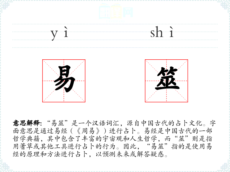 通过对“易筮”的深入学*,我更加理解了其在*传统文化中的重要地位和深远影响。它不仅是一种占卜方法,更是一种哲学思考和人生智慧的体现。在语言学和表达中,了解和掌握这样的词汇,有助于我们更好地理解和欣赏**文化的丰富性和深度。