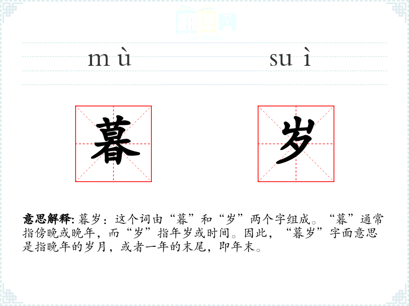 暮岁:这个词由“暮”和“岁”两个字组成。“暮”通常指傍晚或晚年,而“岁”指年岁或时间。因此,“暮岁”字面意思是指晚年的岁月,或者一年的末尾,即年末。