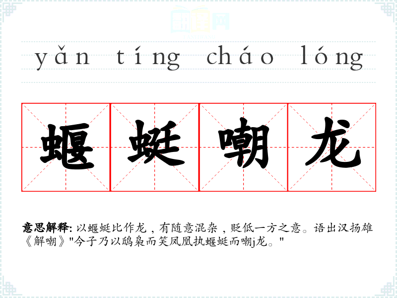 以蝘蜓比作龙﹐有随意混杂﹐贬低一方之意。语出汉扬雄《解嘲》"今子乃以鸱枭而笑凤凰执蝘蜓而嘲j龙。"