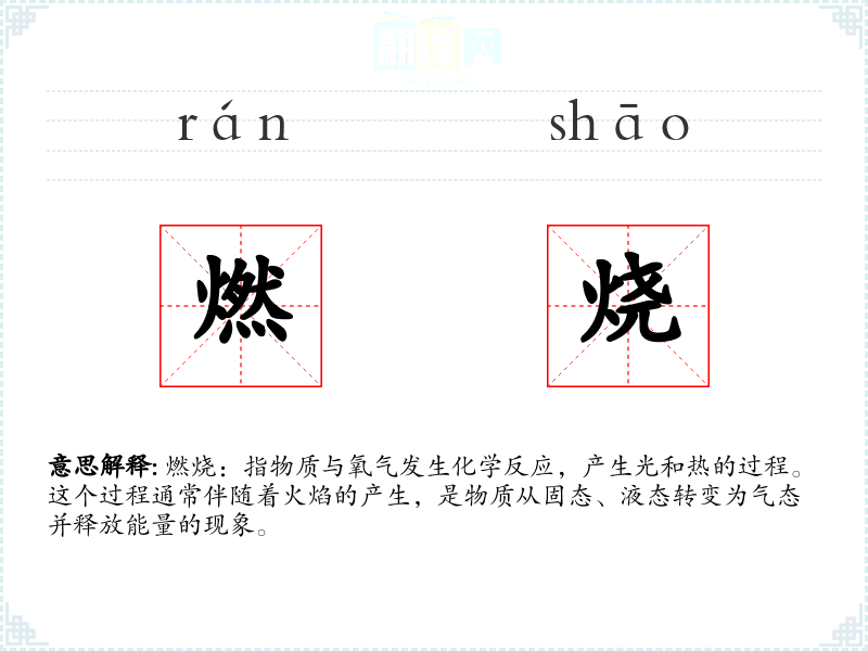 燃烧:指物质与氧气发生化学反应,产生光和热的过程。这个过程通常伴随着火焰的产生,是物质从固态、液态转变为气态并释放能量的现象。