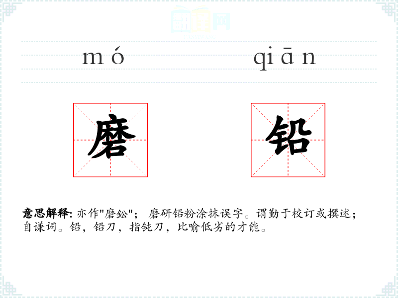 亦作"磨鈆"; 磨研铅粉涂抹误字。谓勤于校订或撰述; 自谦词。铅,铅刀,指钝刀,比喻低劣的才能。