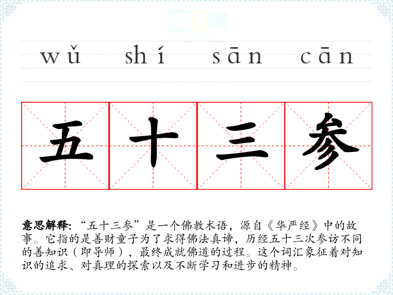 “五十三参”是一个*术语,源自《华严经》中的故事。它指的是善财童子为了求得佛法真谛,历经五十三次参访不同的善知识(即导师),最终成就佛道的过程。这个词汇象征着对知识的追求、对真理的探索以及不断学和进步的精神。