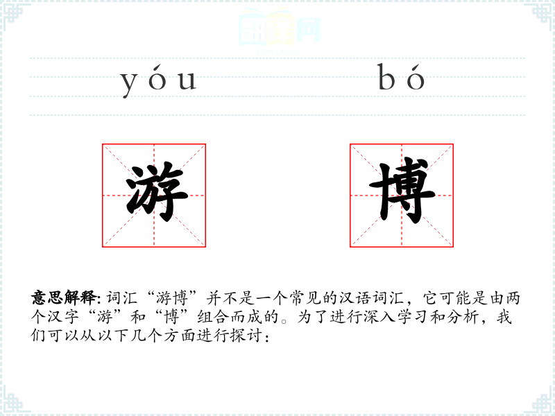 词汇“游博”并不是一个常见的汉语词汇,它可能是由两个汉字“游”和“博”组合而成的。为了进行深入学习和分析,我们可以从以下几个方面进行探讨: