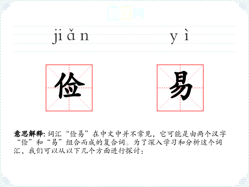 词汇“俭易”在中文中并不常见,它可能是由两个汉字“俭”和“易”组合而成的复合词。为了深入学*和分析这个词汇,我们可以从以下几个方面进行探讨: