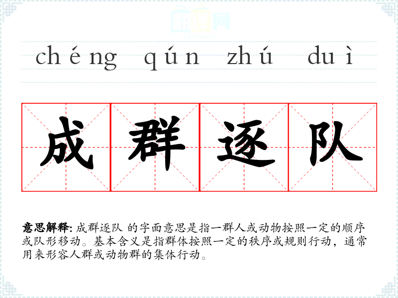 成群逐队 的字面意思是指一群人或动物按照一定的顺序或队形移动。基本含义是指群体按照一定的秩序或规则行动,通常用来形容人群或动物群的集体行动。