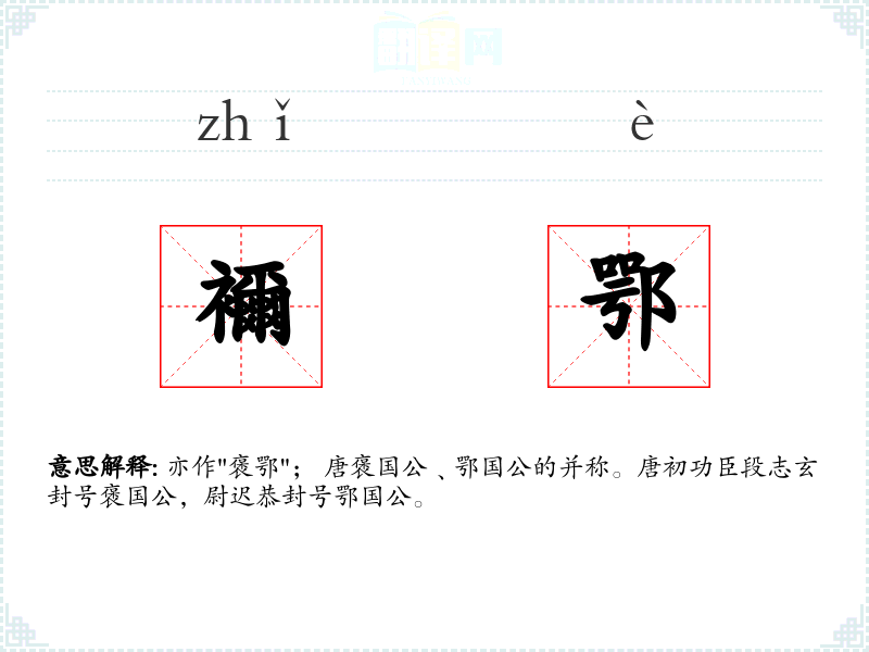 亦作"褒鄂"; 唐褒国公﹑鄂国公的并称。唐初功臣段志玄封号褒国公,尉迟恭封号鄂国公。