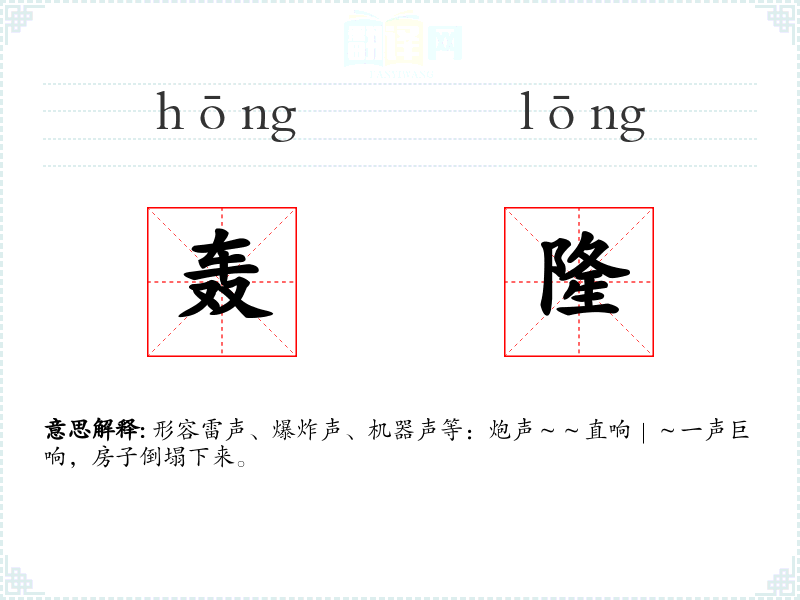 形容雷声、爆炸声、机器声等:炮声~~直响|~一声巨响,房子倒塌下来。
