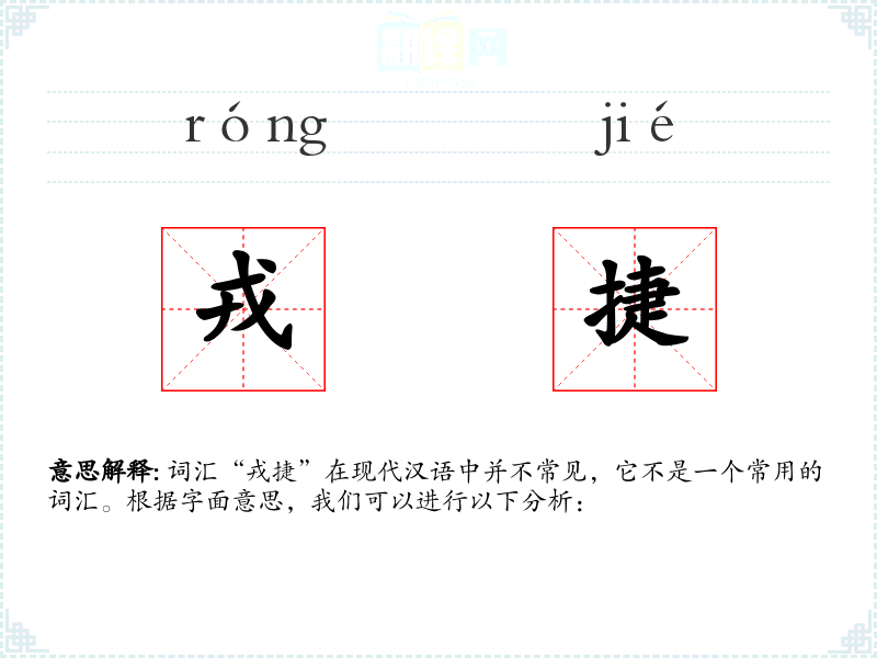 由于“戎捷”不是一个常用词汇,它在现代文学、口语或专业领域中很少出现。在古代文献或历史记载中,可能会用来描述战争的胜利。