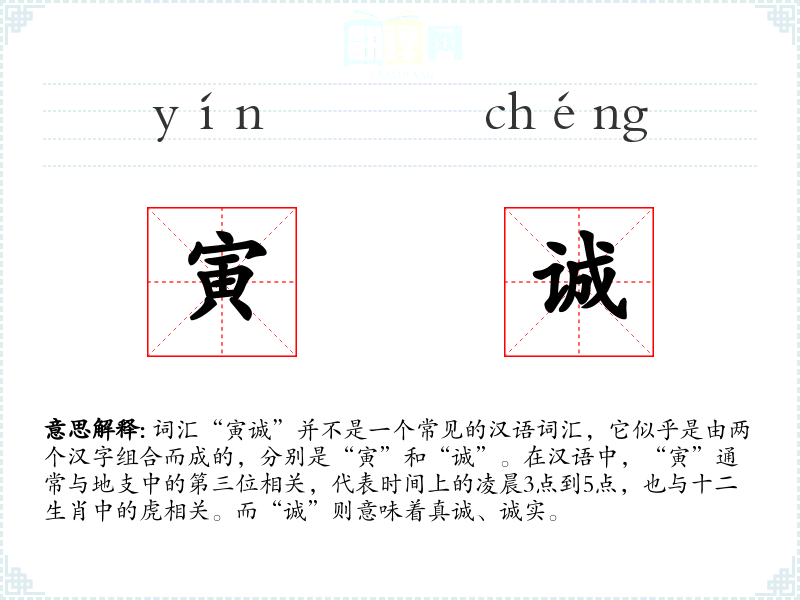 由于“寅诚”不是一个标准词汇,它在不同语境下的使用可能非常有限。如果强行赋予意义,可以理解为在特定时间(寅时)展现出的真诚或诚实。