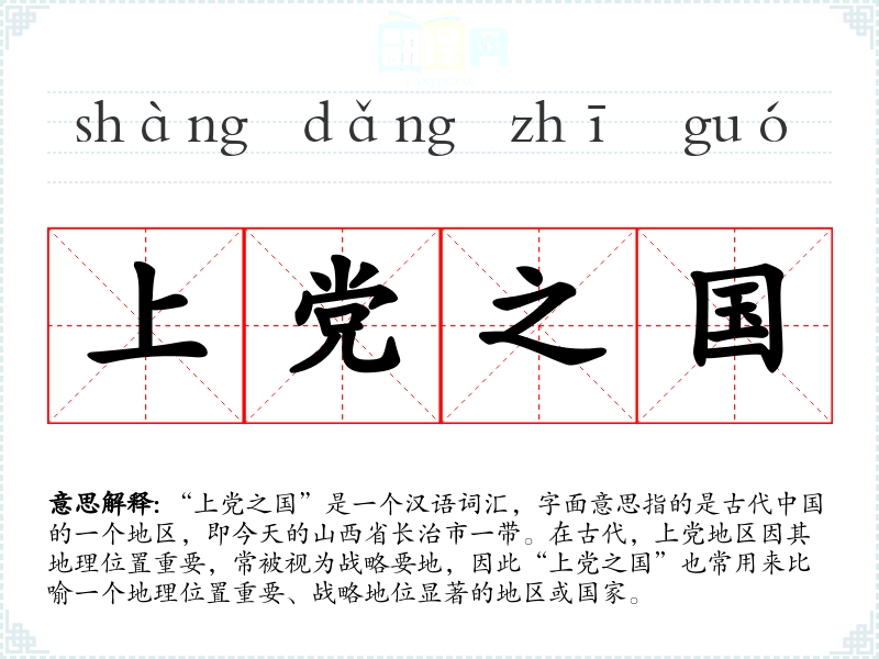 “上党之国”是一个汉语词汇,字面意思指的是古代**的一个地区,即今天的山西省长治市一带。在古代,上党地区因其地理位置重要,常被视为战略要地,因此“上党之国”也常用来比喻一个地理位置重要、战略地位显著的地区或国家。