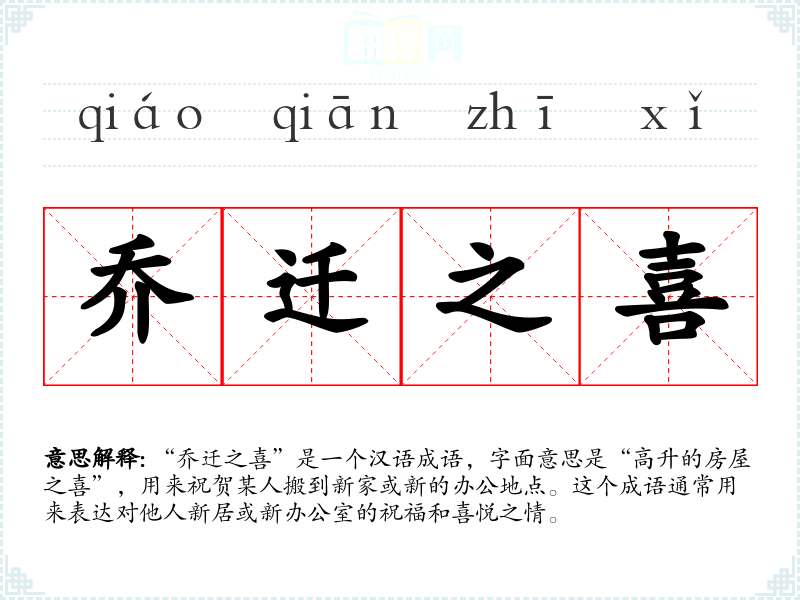 “乔迁之喜”是一个汉语成语,字面意思是“高升的房屋之喜”,用来祝贺某人搬到新家或新的办公地点。这个成语通常用来表达对他人新居或新办公室的祝福和喜悦之情。