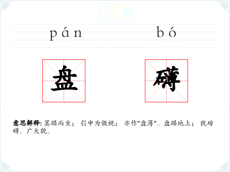 箕踞而坐; 引申为傲视; 亦作"盘薄"。盘踞地上; 犹磅礴。广大貌。