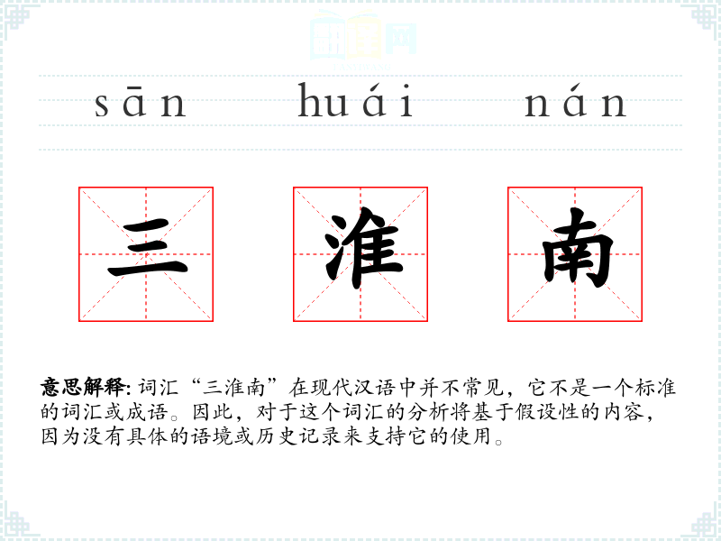 由于“三淮南”不是一个已知的词汇,我们无法提供一个确切的字面意思和基本含义。它可能是由“三”和“淮南”两个词组合而成的,其中“三”通常表示数量,而“淮南”可能指的是**历史上的淮南地区,或者与淮南子等文化概念相关。