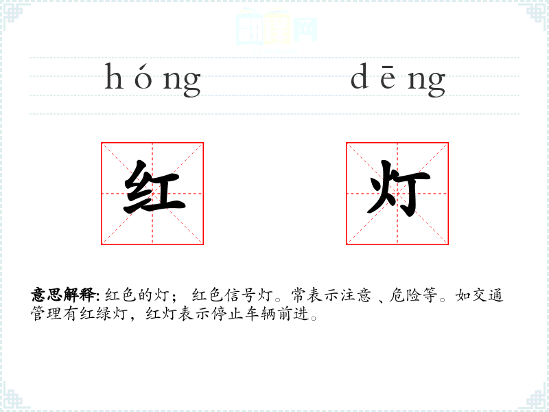 红色的灯; 红色信号灯。常表示注意﹑危险等。如交通管理有红绿灯,红灯表示停止车辆前进。