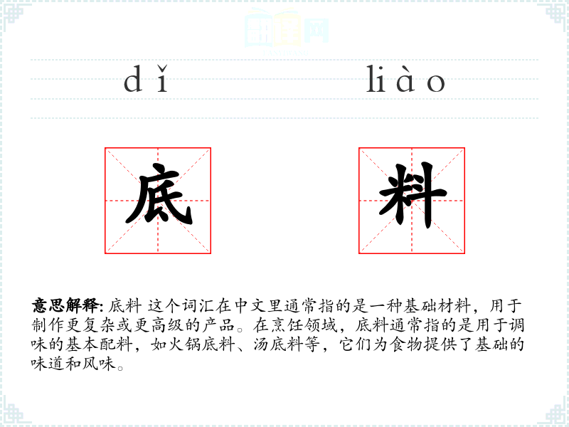 底料 这个词汇在中文里通常指的是一种基础材料,用于制作更复杂或更高级的产品。在烹饪领域,底料通常指的是用于调味的基本配料,如火锅底料、汤底料等,它们为食物提供了基础的味道和风味。