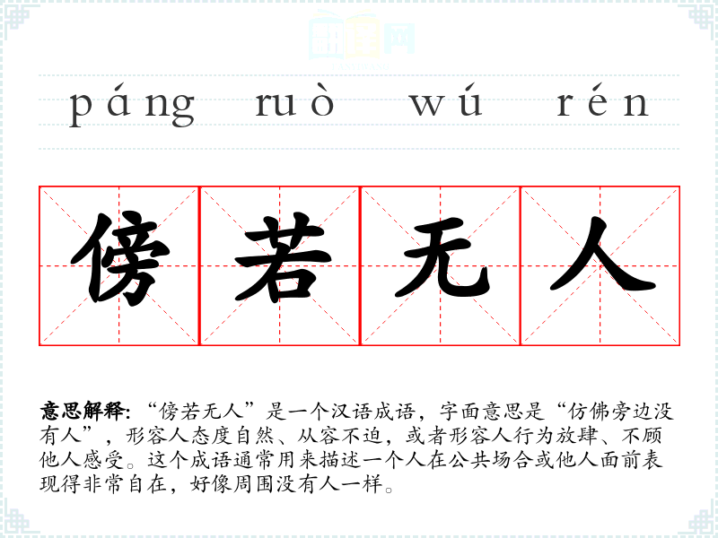 “傍若无人”是一个汉语成语,字面意思是“仿佛旁边没有人”,形容人态度自然、从容不迫,或者形容人行为放肆、不顾他人感受。这个成语通常用来描述一个人在公共场合或他人面前表现得非常自在,好像周围没有人一样。