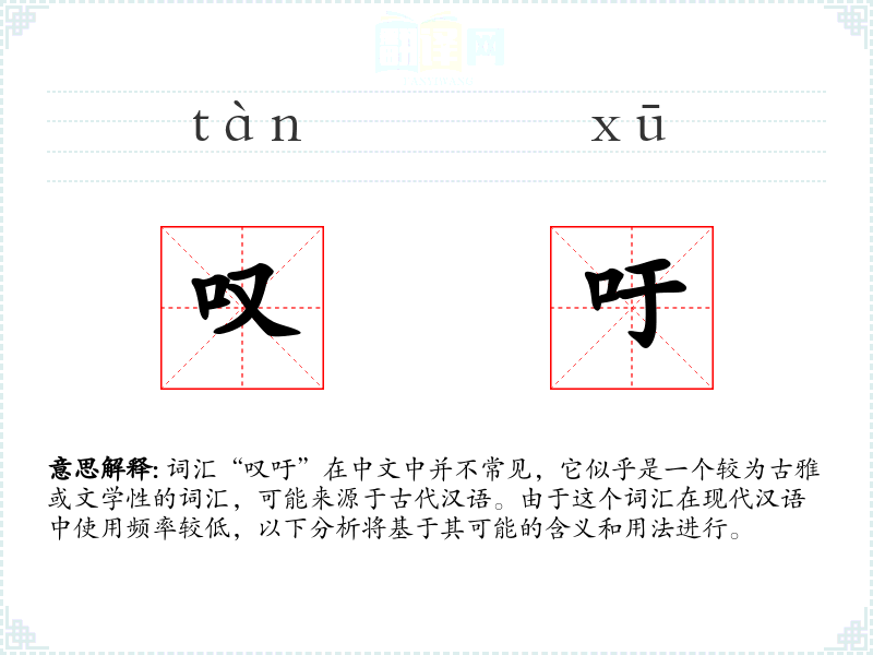 词汇“叹吁”在中文中并不常见,它似乎是一个较为古雅或文学性的词汇,可能来源于古代汉语。由于这个词汇在现代汉语中使用频率较低,以下分析将基于其可能的含义和用法进行。