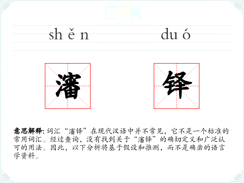 词汇“瀋铎”在现代汉语中并不常见,它不是一个标准的常用词汇。经过查询,没有找到关于“瀋铎”的确切定义和广泛认可的用法。因此,以下分析将基于假设和推测,而不是确凿的语言学资料。