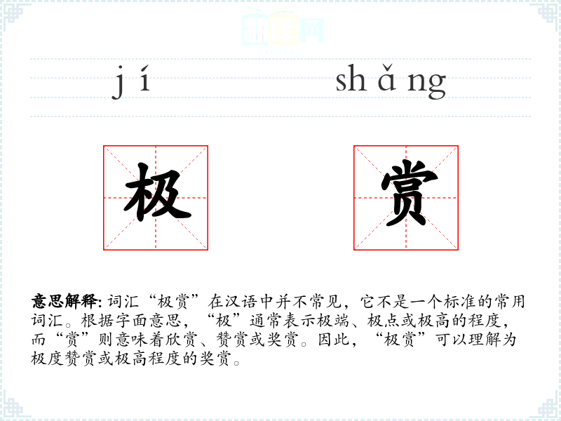 词汇“极赏”在汉语中并不常见,它不是一个标准的常用词汇。根据字面意思,“极”通常表示极端、极点或极高的程度,而“赏”则意味着欣赏、赞赏或奖赏。因此,“极赏”可以理解为极度赞赏或极高程度的奖赏。