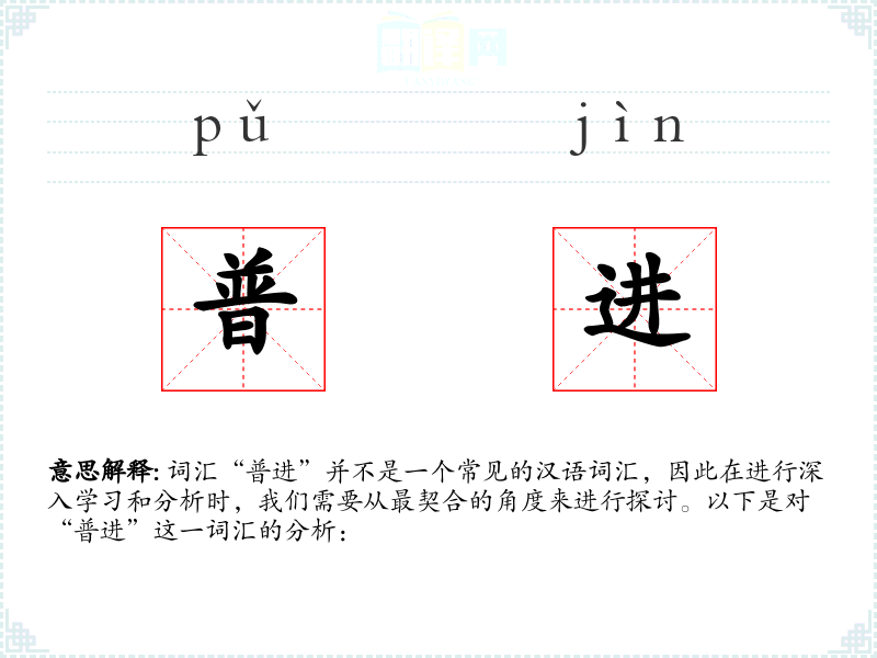 由于“普进”不是一个标准词汇,我们可以尝试从字面意思来解释: