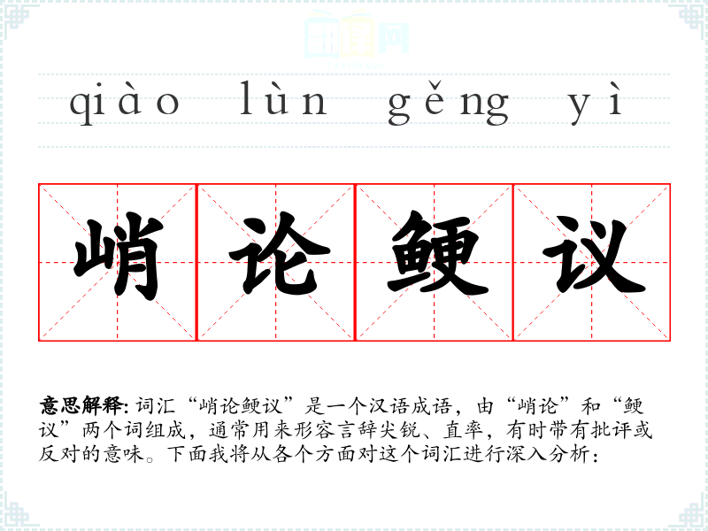 词汇“峭论鲠议”是一个汉语成语,由“峭论”和“鲠议”两个词组成,通常用来形容言辞尖锐、直率,有时带有批评或反对的意味。下面我将从各个方面对这个词汇进行深入分析: