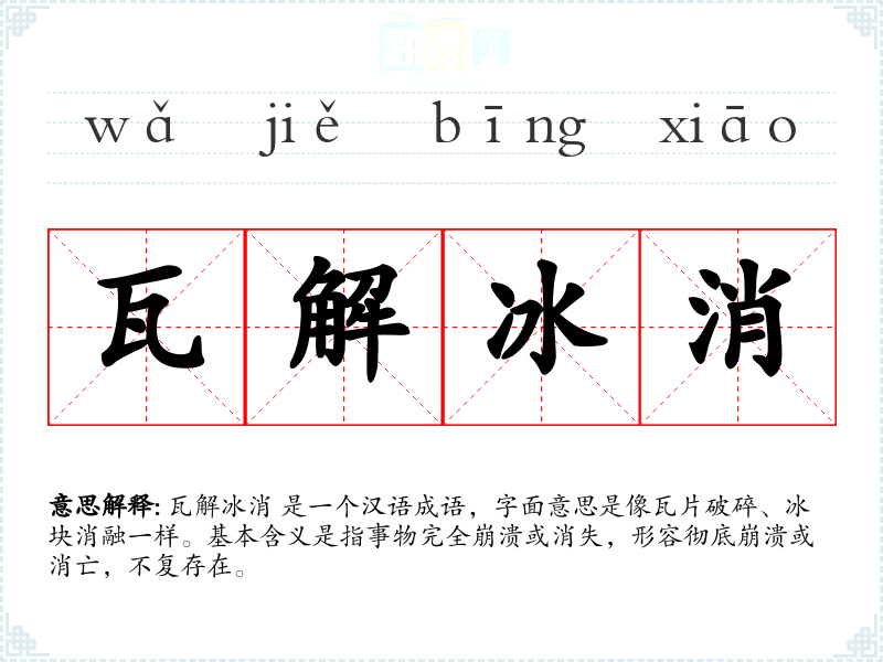 瓦解冰消 是一个汉语成语,字面意思是像瓦片破碎、冰块消融一样。基本含义是指事物完全崩溃或消失,形容彻底崩溃或消亡,不复存在。
