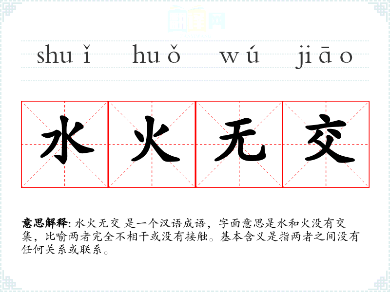 水火无交 是一个汉语成语,字面意思是水和火没有交集,比喻两者完全不相干或没有接触。基本含义是指两者之间没有任何关系或联系。