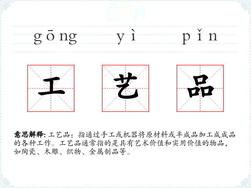 工艺品:指通过手工或机器将原材料或半成品加工成成品的各种工作。工艺品通常指的是具有艺术价值和实用价值的物品,如陶瓷、木雕、织物、金属制品等。