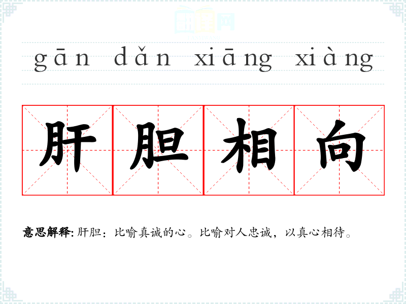 肝胆:比喻真诚的心。比喻对人忠诚,以真心相待。