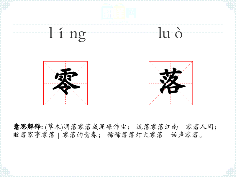 (草木)凋落零落成泥碾作尘; 流落零落江南|零落人间; 败落家事零落|零落的青春;