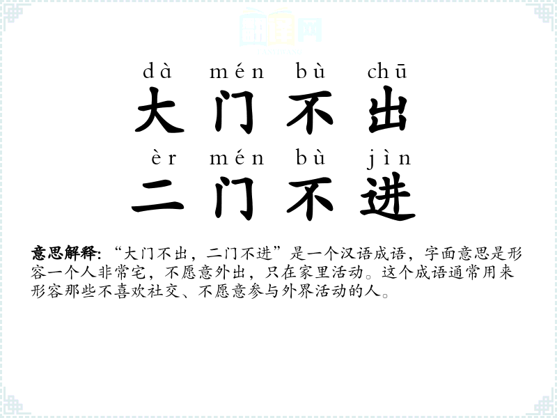 “大门不出,二门不进”是一个汉语成语,字面意思是形容一个人非常宅,不愿意外出,只在家里活动。这个成语通常用来形容那些不喜欢社交、不愿意参与外界活动的人。