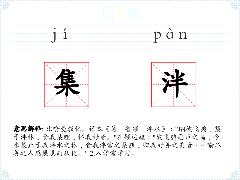 1.比喻受教化。语本《诗.鲁颂.泮水》﹕"翩彼飞鸮﹐集于泮林﹐食我桑黮﹐怀我好音。"孔颖达疏﹕"彼飞鸮恶声之鸟﹐今来集止于我泮水之林﹐食我泮宫之桑黮﹐归我好善之美音……喻不善之人感恩惠而从化。" 2.入学宫学习。