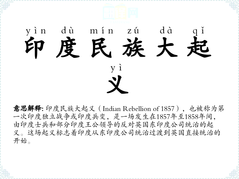 “印度民族大起义”是一个重要的历史词汇,它不仅帮助我们理解特定历史*,还反映了殖民主义和民族主义的复杂交织。在语言学和表达中,了解这样的词汇有助于我们更深入地理解历史和文化背景。