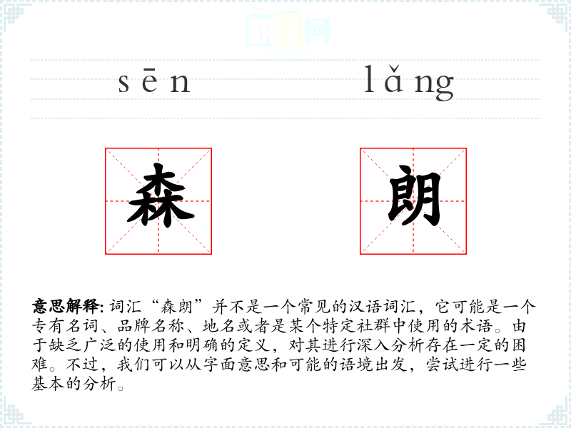 词汇“森朗”并不是一个常见的汉语词汇,它可能是一个专有名词、品牌名称、地名或者是某个特定社群中使用的术语。由于缺乏广泛的使用和明确的定义,对其进行深入分析存在一定的困难。不过,我们可以从字面意思和可能的语境出发,尝试进行一些基本的分析。