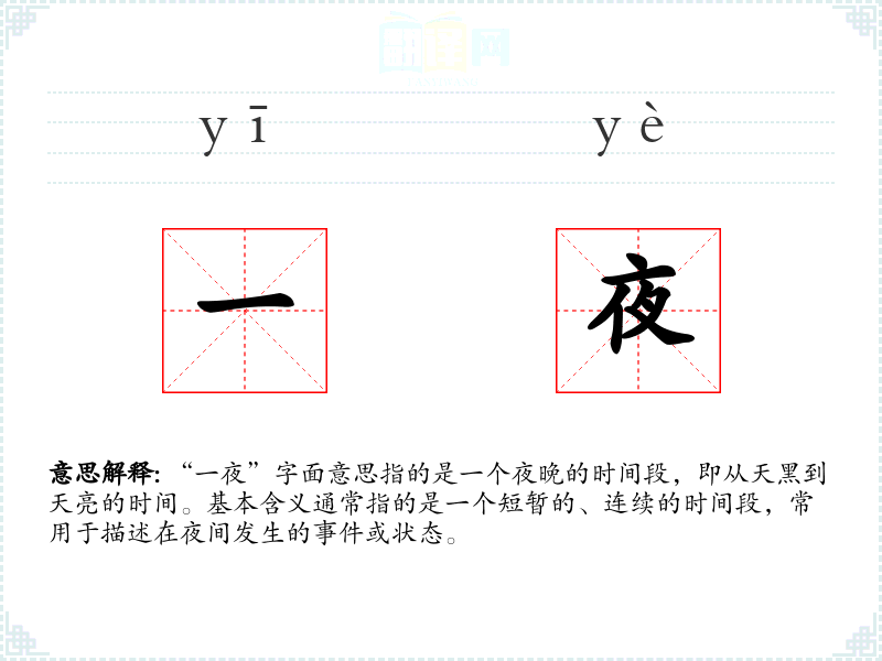 “一夜”字面意思指的是一个夜晚的时间段,即从天黑到天亮的时间。基本含义通常指的是一个短暂的、连续的时间段,常用于描述在夜间发生的**或状态。
