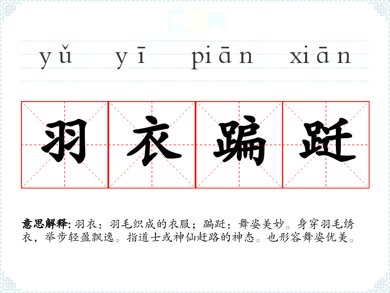 羽衣:羽毛织成的衣服;蹁跹:舞姿美妙。身穿羽毛绣衣,举步轻盈飘逸。指道士或神仙赶路的神态。也形容舞姿优美。