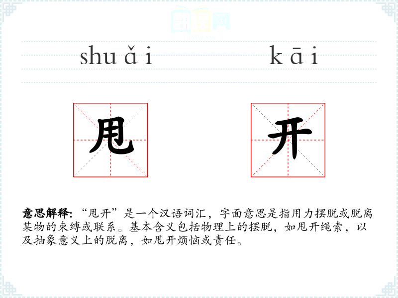 “甩开”是一个汉语词汇,字面意思是指用力摆脱或脱离某物的束缚或联系。基本含义包括物理上的摆脱,如甩开绳索,以及抽象意义上的脱离,如甩开烦恼或责任。