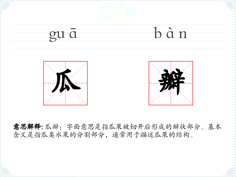 瓜瓣:字面意思是指瓜果被切开后形成的瓣状部分。基本含义是指瓜类水果的分割部分,通常用于描述瓜果的结构。