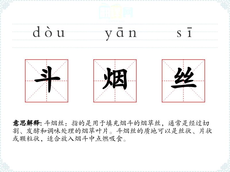 - 反义词:无(因为斗烟丝是一个特定的产品,没有直接的反义词)