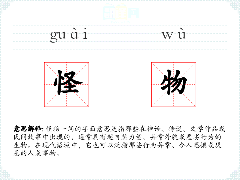 怪物一词的字面意思是指那些在神话、传说、文学作品或民间故事中出现的,通常具有超自然力量、异常外貌或恶劣行为的生物。在现代语境中,它也可以泛指那些行为异常、令人恐惧或厌恶的人或事物。