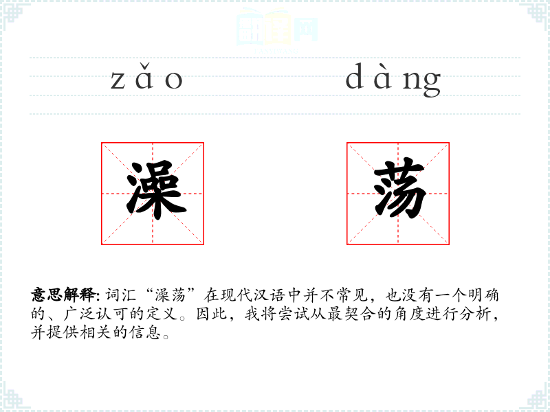 由于“澡荡”不是一个标准的汉语词汇,我们无法给出一个确切的字面意思和基本含义。它可能是由“澡”(洗澡)和“荡”(摇动、清洗)两个字组合而成的一个非标准词汇,暗示一种强烈的清洗或净化行为。