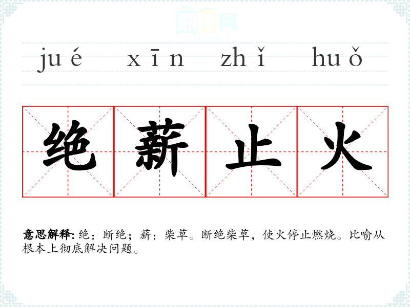 绝:断绝;薪:柴草。断绝柴草,使火停止燃烧。比喻从根本上彻底解决问题。